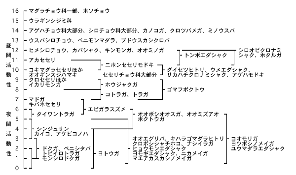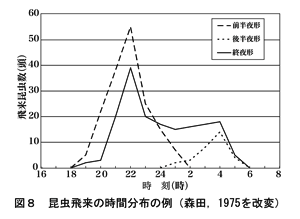 昆虫の活動(飛翔,摂食,交尾,産卵など)には周期性が認められる。昆虫は変温動物であるため,活動には一定の体温を保つ必要がある。とくに昼行性のものでは,気温,太陽放射などの影響が多く,活動の時間も規制される。図8にはガの飛来における代表的な時間分布を示す。また,カの場合は2つの活動時間帯があり,18~22時の前夜半形と朝3時~5時の早朝形となる。