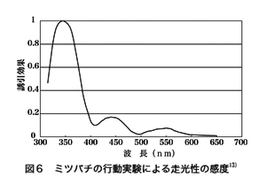 図6はどの色に良く惹かれるのかを行動学的に調べたミツバチの感度曲線である 13)。