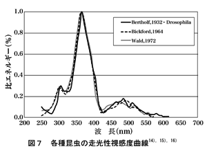 また,図7は照明関連で知られている代表的な視感度曲線を重ねたものであるが,3種の曲線は良く似ていることが判る。しかしながら,Bickford 14)の曲線とWald 15)の曲線は対象の昆虫名が不明確なことが判っている。(著者の調査による)