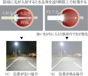 照明器具のグレアが大きくなると視野内に等価光幕輝度1),2),3),4)が発生し,目の視機能が低下する。図1は,等価光幕輝度の発生原理を示したものである。目に強い光が入射すると,眼球内で光が散乱し視野内にベールがかかったように見える。このときの眼球内の散乱光を光幕といい,この光幕と等価な作用をもつ一様な輝度を等価光幕輝度という。グレアが発生すると,この等価光幕輝度により対象物と背景とのコントラスト(輝度比)が落ちるため,対象物の視認性が下がってしまう。これを視機能低下グレアという。「道路照明施設設置基準・同解説」5)では,道路照明環境において良好な視認性を確保するために,視機能低下グレアの評価方法として,相対閾値増加(以下,TI値)を用いて指標を定めている。