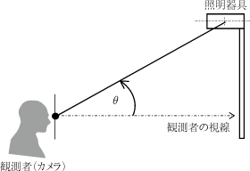 図3は,観測者の視線方向と個々の照明器具との角度との位置関係を示したものである。このとき,個々の照明器具によって生じるLvlは,式(3)によって求められる。式(3)より,Lvlを測定するには,光源の位置情報が必要であることがわかる。