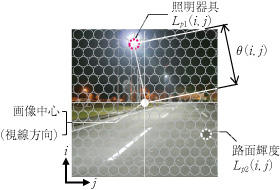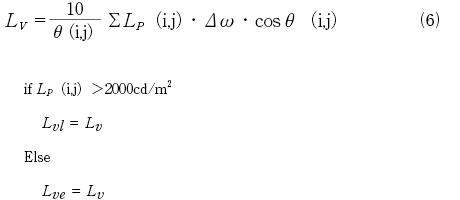 式(3),(5)より輝度画像から等価光幕輝度Lvは式(6)により求めることができる。ここで,LP(i,j)が2000cd/m²以上であれば直接光による等価光幕輝度Lvl,以下であれば反射光による等価光幕輝度Lveとする。