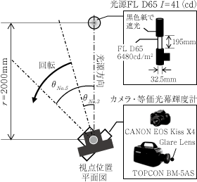 等価光幕輝度Lvlの測定は,視線方向と光源方向とのなす角(θ)を任意の値となるように,等価光幕輝度計とカメラの視線方向を回転させて行った。