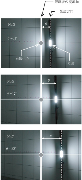 図6は,角(θ)が11°,17°,22°のときの撮影画像である。図より,撮影画像中の光源位置が角(θ)に応じて変化していることが確認できる。この撮影画像から写真測光(図7参照)により求めたLvlと,等価光幕輝度計の測定結果と計算値との比較を行った。