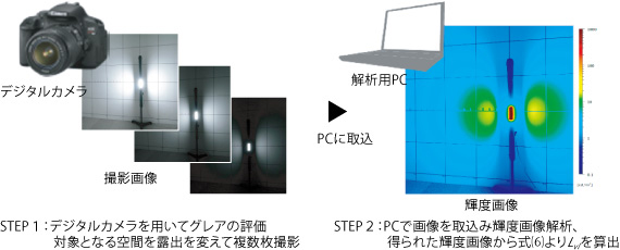 開発した写真測光ソフトウェア(QUAPIX™)の実際の活用イメージを示す(図12参照)。測定対象となる空間のデジタル画像の測定は,写真撮影の要領で行うことができる。そのため,測定を容易に行うことが可能である(図12(a)(b)参照)。また撮影した画像からグレアを評価する手順は4節に述べたように,ソフトウェア上で簡単に行うことができる(図12(c)(d)参照)。