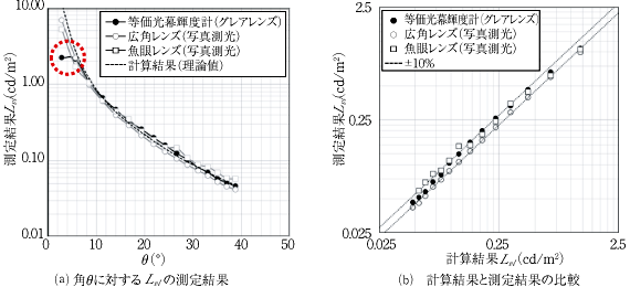 図8は,Lvlの測定結果を示したものである。図8(a)は,角(θ)に対するLvlの測定結果を示したものである。図は,角(θ)が5°以上の場合では,いずれの測定結果も計算値に近似した結果となっていることを示している。しかし,等価光幕輝度計による測定結果は,角(θ)が5°以下になる場合(図中,赤破線円),計算値ならびに写真測光による測定結果よりも低い値となっていることがわかる。図8(b)は,計算値と測定値を直接比較したものである。図は,デジタル画像測光による測定結果は,画像の画素解像度(広角レンズ,魚眼レンズ)によらず,等価光幕輝度計の測定結果,計算値ともによく近似しており,計算結果(理論値)に対して約10%以内の差で測定が可能であることを示している。以上の結果より,写真測光によるLvlの測定は,等価光幕輝度計と同等程度の測定精度を有しており,視線方向が光源に近い場合(θが5°以下)の測定では,より正確な測定が可能であることが確認できた。