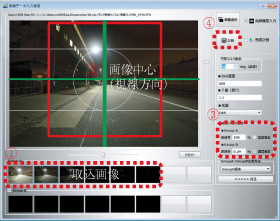 図9は,開発したソフトウェアの起動画面である。ソフトウェアは,以下の手順で輝度画像を計算する。①デジタルカメラにより撮影された異なる露出の複数枚の画像を取り込む。②取込まれた画像の中から視線方向となる計算の中心点(図中,緑十字線)と計算範囲(図中,赤線)を設定する。③撮影時に用いた減光フィルタの透過率などを入力する。④輝度画像を計算する。