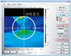 図10は,計算された輝度画像の解析画面である。この輝度画像からグレアを評価する。ソフトウェアでは,輝度画像から求められた等価光幕輝度より,TI値の算出が可能である(図中,赤破線)。さらに,輝度画像を用いることで車のルーフを考慮した20度遮光の有無などを任意に設定することができる。このように写真測光では,グレア評価の際に重要なパラメータとなる視線方向などを任意に調整することができ,簡単なだけではなくより正確なグレア評価を可能としている。