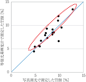 図11は,実際の道路照明の施工環境にて,TI値の測定を等価光幕輝度計と写真測光(広角レンズ)で行い,結果を比較したものである。