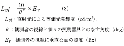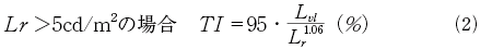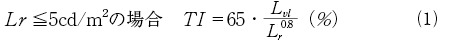TI値は,運転手の視野内の光源からの直接光による等価光幕輝度Lvlと平均路面輝度Lrがわかれば,式(1)(2)により求めることができる。