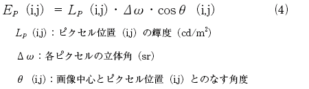 図4は,輝度画像と各ピクセルの位置関係を示したものである。このとき,画像の各ピクセルから画像中心(カメラ設置位置)への照度EP(i,j)は式(4)により計算することができる。
