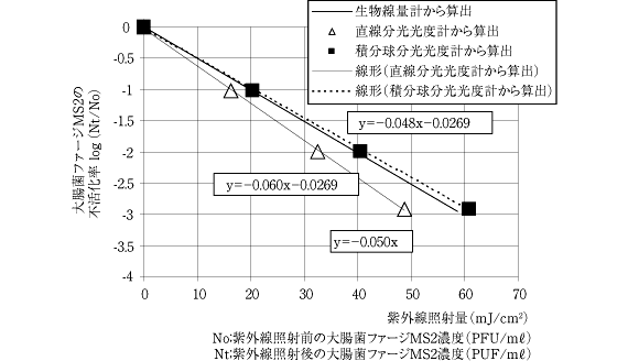 ただし,実際の下水処理施設を想定した場合,対象水の積分球分光光度計による吸光度を毎回測定することが出来ない。そのため,我々は,適正な紫外線照射量を換算できる補正方法についても検討を行った。