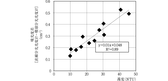 図2 下水(最初沈殿池越流水)における濁度と吸光度差(直線分光光度計-積分球分光光度計)の相関*