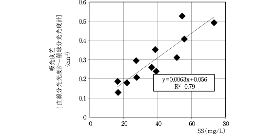 図3 下水(最初沈殿池越流水)におけるSSと吸光度差(直線分光光度計-積分球分光光度計)の相関*
