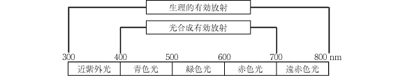 太陽放射は,地球上に直達するまでに種々の散乱や吸収を受け,波長約300~3,000nmの範囲が直達光放射と言われている。この放射は,大きく3つに分類され,紫外放射,可視放射,赤外放射と呼ばれている。人間の視覚に必要な可視放射の範囲は380~780nmで視感度(明所視)のピークは555nmにある。植物にも同様に生理的に必要とされる放射の範囲がある。一方,植物に有効な放射には,生理的有効放射(Physiologically Active Radiation)と光合成有効放射(Photosynthetically Active Radiation:PAR)と呼ばれるものがある(図1参照)。生理的有効放射は波長約300~800nmの帯域で,光合成や色素の生合成,光周性,屈光性,形態形成等,生理的に何らかの効果があるとされている1)。生理的有効放射はその範囲を作用別に5帯域(300~400nmを近紫外光=UV,400~500nmを青色光=B,500~600nmを緑色光=G,600~700nmを赤色光=R,700~800nmを遠赤色光=FR(FarRed))に区分される。光合成有効放射(PAR)は,生理的有効放射の波長範囲内(400~700nm)にあって植物の成育のエネルギー源となるため強い光強度を必要とする。単位は,人間の眼と異なるため専門的には照度(ルクス)は使用されない。光化学反応を介しているため波長範囲内の総光量子束をもって表される。この場合,光源から放射されるエネルギーとして,光合成有効光量子束(Photosynthetic Photon Flux:PPF)と呼ばれる。一方,植物体が受光するエネルギーは光合成有効光量子束密度(Photosynthetic Photon Flux Density:PPFD)と呼ばれ,SI単位系によりμmoℓ・m⁻²・sec⁻¹で表される。また関連するガス交換においてもmoℓ単位が使用されるため整合性があるとされている。