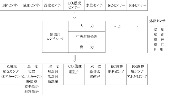 人工光源による光環境制御,コンピュータによる温度,湿度などの気象環境制御 | 水耕栽培などによる施肥,冠水の自動制御 | コンピュータによる集中管理,周年,安定数量,同品質,省力化による栽培実現 |