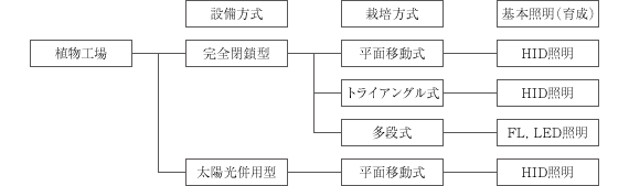 植物工場の種類は,設備方式により大きく2つに大別される(図6参照)。太陽光を完全に遮蔽した「完全閉鎖型」と太陽光を利用しながら不足光量を人工光源で補光する「太陽光併用型」である。さらに,具体的には植物の栽培方式により被照明面は大きく3つに分類される。平面移動式,トライアングル式,多段式である。平面移動式は成育段階で密植による成育不良を避けるため株間を広げる移動を行う方式,トライアングル式は栽培面積を増加させるため栽培パネルを三角錐形に立体的にした方式,多段式は5~10段の棚式で栽培面積を立体的に増加させる方式である。それぞれの栽培方式により照明方式も異なる。平面移動式については通常の高輝度放電(HID)ランプと反射笠(広照型)で,トライアングル式ではHIDランプによる特殊双照型照明器具で,多段式においては照射距離が短いため蛍光ランプ(FL)や発光ダイオード(LED)による近接照射が行われている。