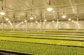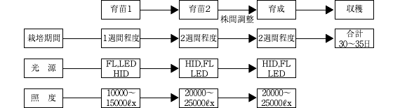 育成照度レベルは,成育段階により2つに分かれる(図7参照)。播種時については,通常1~2日間の暗黒下で発芽させる。発芽後,「育苗1」として,FL・LEDやHIDランプによる10000~15000ℓx(150~200μmoℓ・m⁻²・sec⁻¹)の照度下で1週間程度照射され,その後「育苗2」として20000~25000ℓx(250~350μmoℓ・m⁻²・sec⁻¹)で約2週間栽培される。「育苗2」の後,株間調整を行い「育成」で2週間程度経過後,収穫される。育苗から収穫までの期間は,栽培品種によっても異なるが30~35日間とされている。