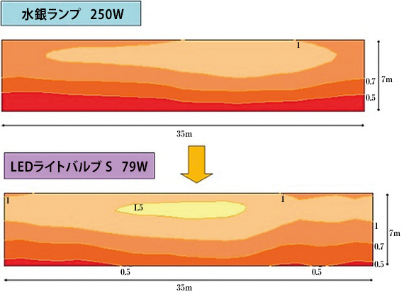 水銀ランプ250Wから置き換えた場合,消費電力を約66%削減した(200V時)。