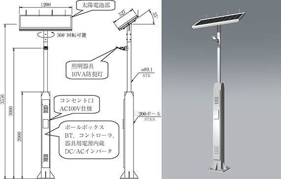 □200のバッテリーボックス一体形ポールを新たに開発。これによりデザイン性向上と設置場所が限定されない製品化を実現した。(歩道などに設置した場合でも,歩行の妨げにならない。)