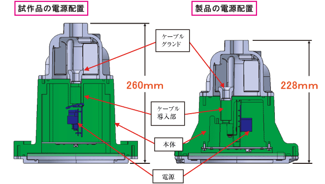 電源の配置について,開発当初は本体の中央にケーブル導入部を配置したが,本体中央に凹部が形成されるため,その下部に電源を配置した場合に本体が大きくなる問題が発生した。そこで,ケーブル導入部を中央から外側にずらし,それにより空いたスペースに電源を配置するように設計変更した。その結果,本体の外径を大きくせずに本体の高さを32mm低くすることができ,本体のコンパクト化が達成できた(図2参照)。