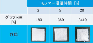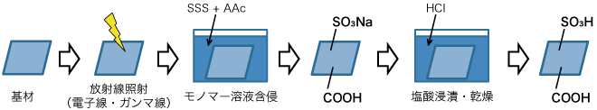 SSSとAAcの2つのモノマーを,前照射法にて基材にグラフト重合した。前照射法はホモポリマーの生成がほとんど無く,EB照射装置の汚染の心配が無いためである。