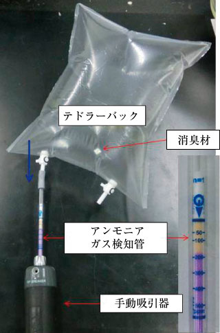 ガス密閉性・耐食性の高いコック付き袋(テドラーバック)内に作製した消臭材料を入れ,濃度調整した塩基性ガスであるアンモニアを導入する(図7)。