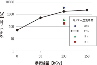 吸収線量が大きく,モノマー溶液への浸漬時間が長いほど,グラフト率は高くなる傾向である。しかし,吸収線量100,150kGyではグラフト率に大きな差はなく,サチュレーションしているように見受けられる。モノマー溶液への浸漬時間については,長くするほどグラフト率が高くなる。しかし,生産を考えた場合には,浸漬時間は短い方が望ましい。