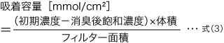 アンモニア導入後,経過時間ごとにガス検知管(ガステック社製)でアンモニア濃度を測定する。袋内のアンモニア濃度が変化しなくなった時点で,式(3)より消臭材料の単位面積当たりの吸着容量[mmol/cm²]を算出した。