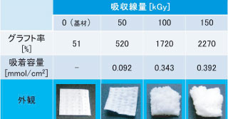 吸収線量が大きいほど,グラフト率が大きくなり,基材が膨張した(表2)。これは,吸収線量が大きい程,基材にラジカルが多く発生し,モノマーが多く付与した為と考えられる。吸着容量は,グラフト率が高いものほど大きくなることが確認できた。