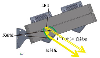 HIDランプの光は360°全周方向に光を出すのに対し,LEDユニットの光は片側の180°のみとなる。本来であれば,光軸方向へLEDを垂直に向けることが最も有効であるが,本器具は上方光をカットする必要があるため,LEDの取付角度(器具取付角度)を17.5°とし,LEDから出た光を反射で40°前進させ,合計57.5°前進させた配光制御を行っている。