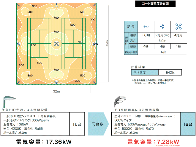 前述の配光制御方法のLEDユニットを2個使用し,適切な配光と明るさを作り出すことで,従来のHIDメタルハライドランプ1kW適合 アイ テニスターと同等の照明をLED500Wで実現した。これにより,HIDからLEDへ同じ配置で1対1の置き換えができ,約58%の大幅な省エネを可能とした。図4に照度分布図の一例を示す。