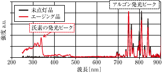 未点灯品は封入ガスであるArの発光ピークしか見られないのに対して,エージング品は,340nm近傍に沃素分子に帰属されるピークが確認できる。これは,封入したCoI₂が点灯時の高温プラズマ中においてはCoと沃素(I₂)に熱解離するため,消灯時に全てが元通りに化合せず,一部が遊離I₂として残留しているからだと考えられる。
