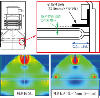 具体的には,発光管両端部の外表面近傍に共振器壁と電気的に接続された導電性(アルミ製)の始動補助板を設置した。この補助板は,共振器の中でアンテナとして作用し,その先端部に強い電界を誘起することが期待できる。図6は,補助板設置前後の無負荷時(ランプが点灯していない状態)における共振器内の電界分布図をシミュレーションしたものであり,補助板先端部に強い電界が誘起されているのがわかる。