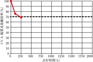 一般的に,印刷・硬化用途に用いられるUVランプの寿命の定義としては初期照度あるいは光量に対して70%を下回った時間とされるが,無電極ランプは電極材料の飛散等による寿命への影響が原理的にないため,有電極ランプが1000時間程度の寿命であるのに対して,3000~5000時間と長寿命であるという特長がある。しかしながら,今回検討した無水銀ランプにおいては,250時間という短時間で発光部の黒化が発生し,極めて短寿命であるという問題が浮上した。