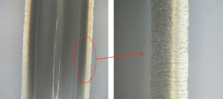 黒化の原因を探るため,当該部の観察及び元素分析を行った。観察結果から,黒化は発光管表面への異物の付着や薄膜形成によるものではなく,石英管そのものが変色していることに起因していることが判明した(図8)。