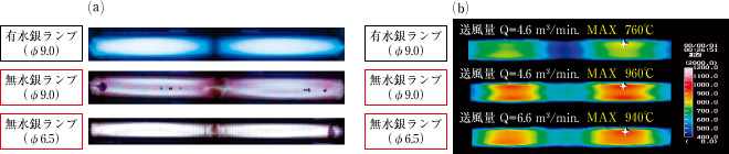 図9 有水銀・無水銀ランプの点灯アーク(a)及び熱画像写真(b)(1.5kW点灯時)