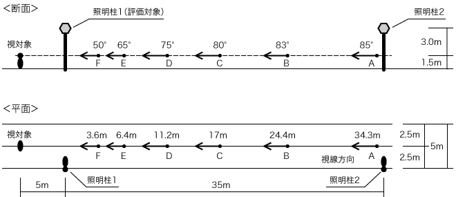 実験は,図1に示す工場敷地内にある幅員5mの実験道路に,防犯灯Ⅰ・Ⅱを35m間隔で設置した照明柱の高さ4.5mに取り付けて行った。図1に,評価地点A~Fにおける評価対象の防犯灯までの距離と,視線から防犯灯への仰角を示す。また,防犯灯Ⅰ・Ⅱを同時に点灯したとき,路面の水平面平均照度は7ℓx程度で,アスファルト路面の反射率がおよそ10%だったことから,実験環境の路面輝度は薄明視の順応輝度範囲であったといえる。