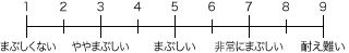 実験は主観評価実験とし,被験者は視線を視対象(マネキン)の顔部分に固定し,11地点(A→B→C→D→E→F→E→D→C→B→Aの順)から評価対象の防犯灯のまぶしさを図2に示す評価スケールを用いて評価した。回答は1~9の整数のみ許可した。防犯灯Ⅰの不快グレア評価の実施後,防犯灯Ⅱの不快グレア評価を実施した。被験者は20代の学生8名と,20代から40代の社員8名の計16名とした。