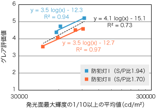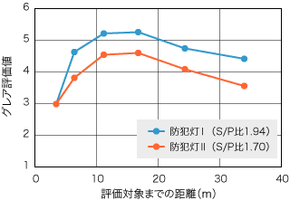 白倉ら3)の実験を踏まえて,筆者もLED防犯灯を用いた不快グレア評価実験を実施し,S/P比の高い光源は不快グレアを感じやすいのか,周辺視評価にて検証を行った。実験に使用した防犯灯ⅠとⅡは配光特性や光束が同じLED防犯灯で,光源のS/P比(相関色温度)のみ防犯灯Ⅰが1.94(6300K),防犯灯Ⅱが1.70(4700K)と異なっている。