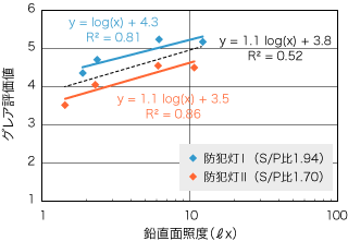 本報告でも,S/P比(相関色温度)の異なる2種類のLED防犯灯を用いて,不快グレアの評価実験を実施した。その結果,光学測定結果(鉛直面照度や器具発光面の輝度分布)が概ね同じだったにも関わらず,S/P比の高い防犯灯の方がグレア評価値が大きい(まぶしい)ことを確認した。光学測定結果と不快グレア評価が対応しないままでは,グレアを抑制した照明器具の開発が困難となる。