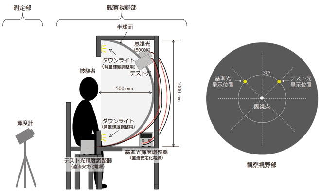 図6に実験装置の模式図を示す。実験装置は,半球面形状の観察視野部と測定部から構成されている。観察視野部は基準光とテスト光および固視点から構成される。観察視野部の背景輝度は調整できるように,半球面外縁部に沿って等間隔に6台の調光対応型ダウンライトを設置した。6台のダウンライトを調光制御することによって,観察視野部の背景輝度を1.0,0.1,0.03cd/m²の3段階にコントロールできるようにした。