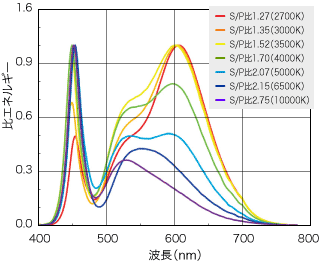 基準光とテスト光の呈示サイズは視角0.6°で,呈示位置は視線から離角30°とした。基準光はS/P比2.07(5000K)の白色LEDを用い,輝度3.0×10⁵cd/m²一定で被験者方向に照射できるようにした。テスト光はS/P比1.27(2700K),1.35(3000K),1.52(3500K),1.70(4000K),2.15(6500K),2.75(10000K)の6種類の白色LEDを用い,被験者方向に照射できるようにした。テスト光の輝度は被験者の手元にある調光器で調整できる仕組みとした。実験に用いた白色LEDの分光分布特性を図7に示す。測定部では,被験者が調光したテスト光の輝度を測定できるように,輝度計(トプコン製BM-5 AS)を設置した。被験者は20代から40代の色覚正常な男女11名(平均36歳)とした。