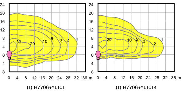 単灯でYL1011を装着した場合とYL1014を装着した場合の水平面照度分布を図4に示す(設置高さ:10m,器具:H7706,光源:NHT180LS)。YL1014の場合,ポール後方2mの位置での照度は約1ℓxであった。