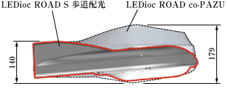 当ガイドラインが定める歩道照明の基準(平均路面照度5ℓx,10ℓxの2種類)に適合した配光を有するLED照明器具は,当社の商品の中では2012年10月発売のLEDioc ROAD co-PAZU™がある。この器具はHID光源用に開発されたものであり,LEDランプに置き換えるにはサイズが大きいこと,現在のLEDの固有エネルギー消費効率は,当器具発売当時の60ℓm/W程度から大幅に向上していること,価格競争に対抗する必要があることから,商品のリニューアルが求められた。