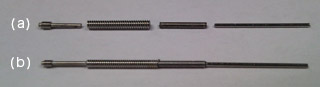 図3に母材の溶接前後の写真を示す。図3において,(a)は溶接前の母材を一直線に並べており,母材間の3ヶ所を溶接する。(b)は溶接後の部品である。なお,母材の線径は 1mm程度である。
