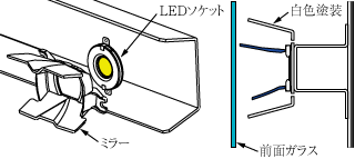 また,ガラス面の反射により器具内に吸収される光を極力少なくするよう,LED周りの板金部品の塗装や形状を見直すことでさらなる効率改善を実施した。(図3)