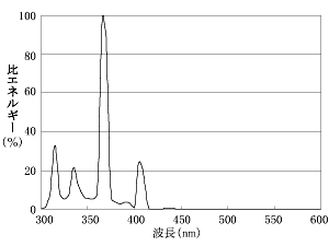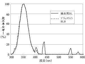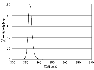 古くは,誘蛾灯としてイネの害虫ニカメイガの視感度に合わせた図9の分光分布を有する青色蛍光ランプが有名である。しかしながら現在では,ハエや蜂などの一般昆虫の視感度から,365nmのUV放射を基本としたブラックライト蛍光ランプが誘引用として利用されている。ブラックライト蛍光ランプには,365nmを主波長とするUV放射と可視放射(青色光)を含んだ捕虫用(光化学用)(BL形)と,365nmのUV放射のみを濃青色フィルターで選択透過させたブラックライトブルー形(BLB形)の2種類(出力:2~40W)がある。図10にそれらのランプの分光分布を示す。また,ブラックライト水銀ランプ(出力:100・250・400W形)も,UV放射による各種試験や検査照明用,蛍光塗料を発光させるディスプレイ照明用に利用されている。図11にこのランプの分光分布を示す。さらに最近ではLEDにおいても365nmを主波長とするUV-LEDも開発されている。図12にUV-LEDの分光分布を示す。