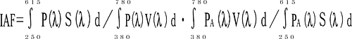 昆虫にも光に集まる走光性があるため,昆虫の視感度曲線を光源の分光分布に乗じることで誘虫性を示すことが出来る。具体的には対象光源の分光分布を250nm~780nmまで計測し,昆虫の視感度曲線の範囲250~615nm(Bertholf)を乗じ,積分したものを,光源の分光分布に人間の視感度を乗じ,積分したもので除することで示される。以下に計算式を示す。