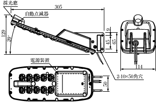 - ※自動点滅機能なしタイプは,きょう体は共通であるが,センサ部はセンサ取付用の加工をしていないため,センサおよびセンサカバーは組み付けられていない。